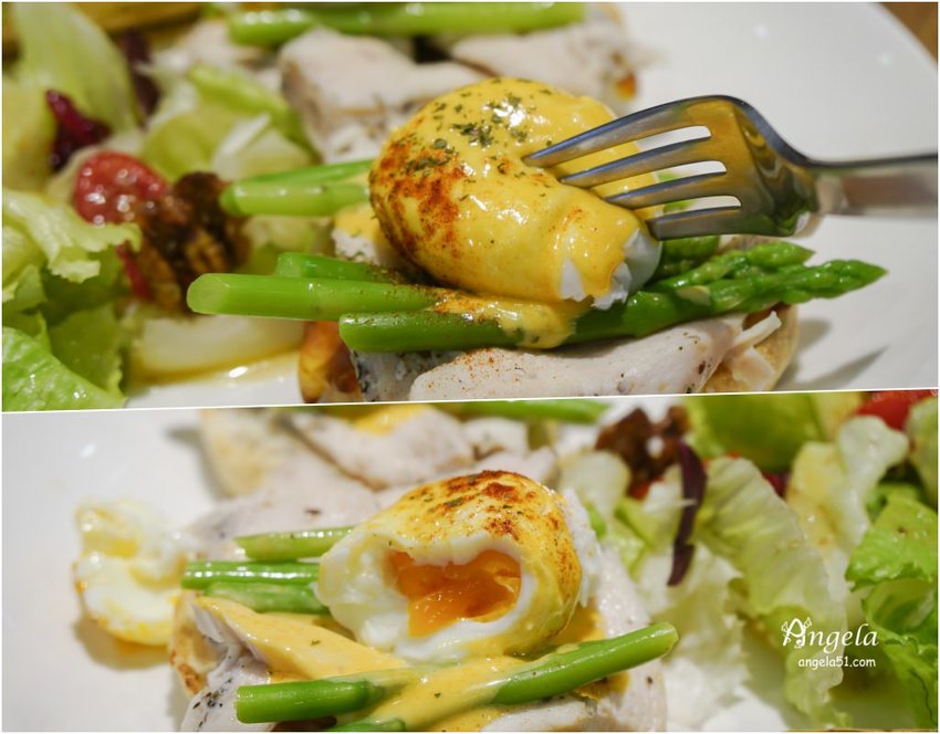 香料嫩雞班尼迪克蛋,用瑪芬堡當底層,瑪芬堡吃來外皮酥脆麵包體軟綿,搭配嫩雞肉與滑順的班尼迪克蛋味道也不賴。唯一可惜是班尼迪克蛋一刀切下沒有爆漿的誘人畫面。