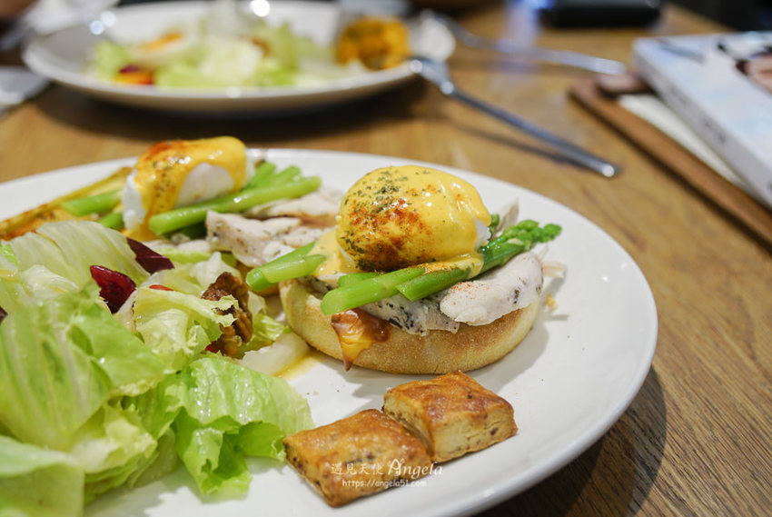 餐點一上桌滿有自然清新的質感,香料嫩雞班尼迪克蛋早午餐,除了主菜外,還有佐以蜂蜜紅酒醋的清爽沙拉與店家手工製作的檸檬奶油司康。這裡的司康不是走傳統的外型路線,而是一口方型小巧的造型,司康軟硬度很剛好,也不乾柴滿好吃的。