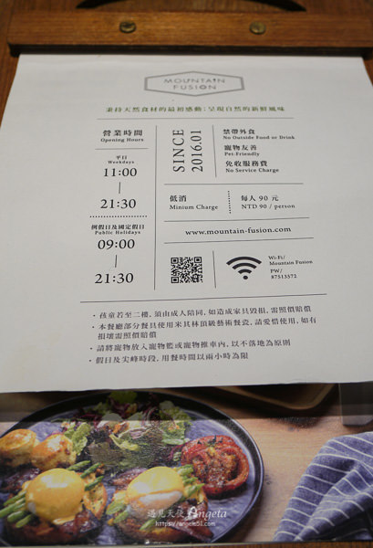 整體來說,Mountain Fusion 的餐點滿有質感精緻的,用餐環境舒適自在,店內低消每人90元,假日有用餐時間限制2小時,若無人候位不會特別限制,Mountain Fusion 還是寵物友善餐廳,帶寵物來也可以。