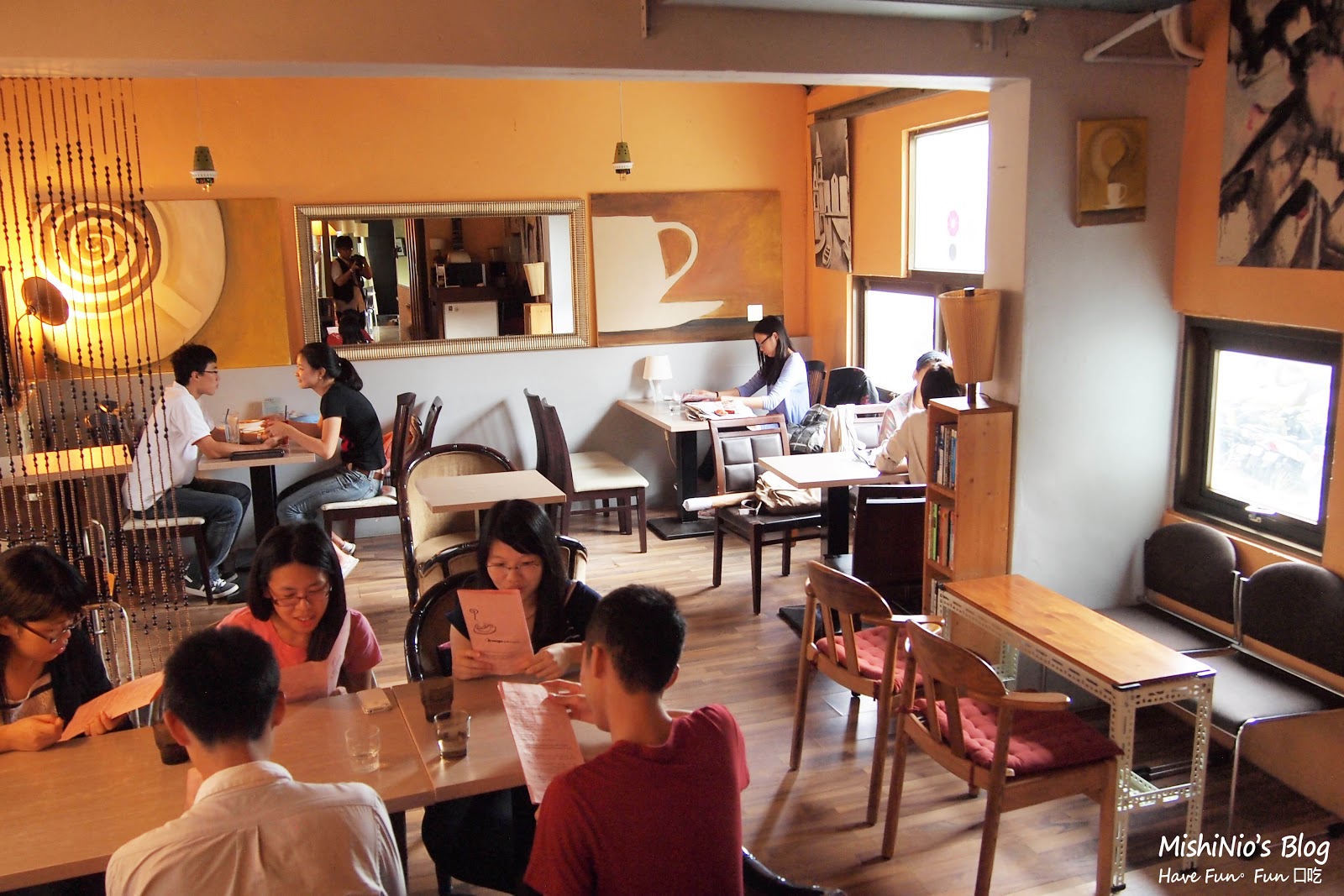 此區為2樓前區座位 粉綠色的牆上掛了許多的攝影作品