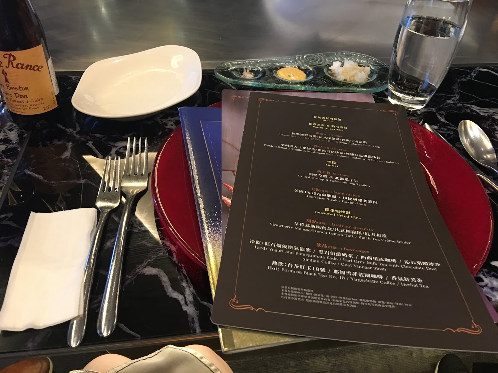 入座後,看到擺設好的餐具與夏慕尼菜單。雖然去過日本吃過神戶牛的鐵板燒,覺得我們的價格親切而且菜色很豐富,果真我是個台灣人,喜歡fancy 多元的菜色。我們點了當季的套餐,都選擇牛排。
