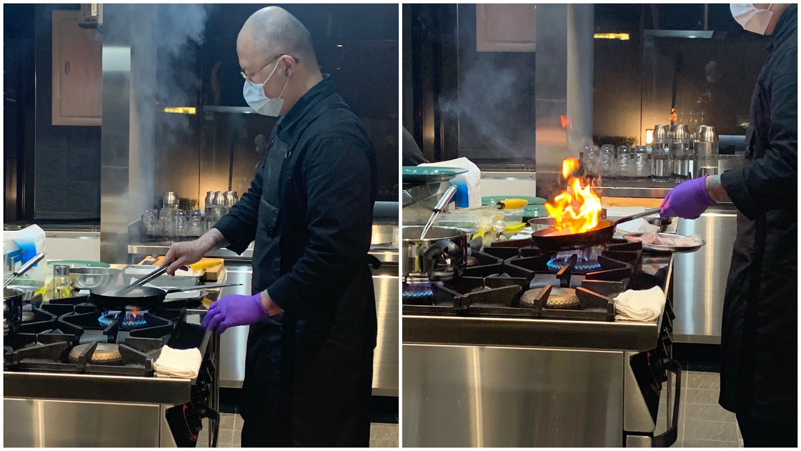 因為坐在吧台的關係,剛好看到主廚正在將剛水煮後的雞肉,用平底鍋乾煎增加風味,主廚俐落地烹煮食物,相當帥氣。