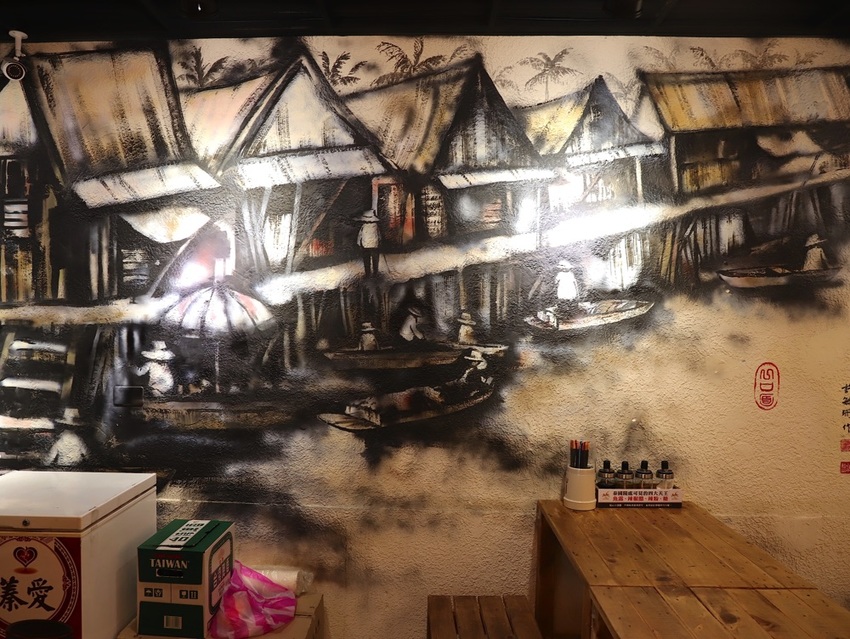 ▼《一口麵 Yi kou boat noodle》有一整面牆 特別請人手繪 泰國水上市場的景象~