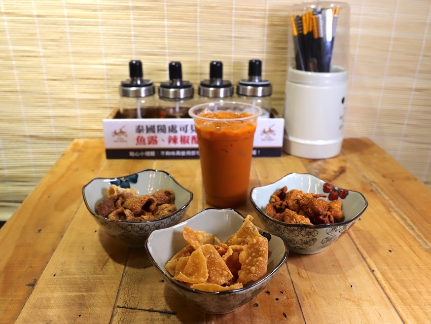 ▼先送上的~ 是飲料:泰式奶茶 & 炸物小菜:炸餛飩皮、炸豬皮、炸雞皮