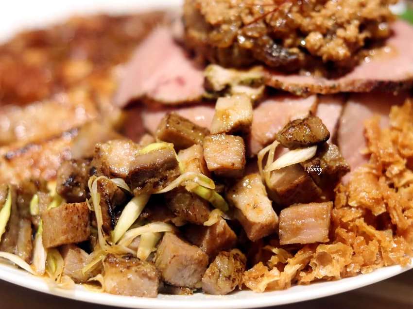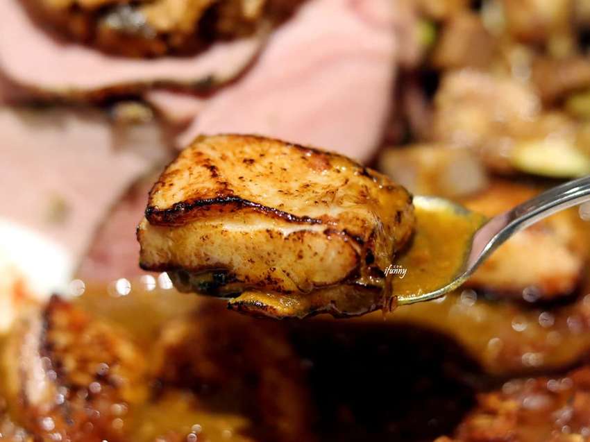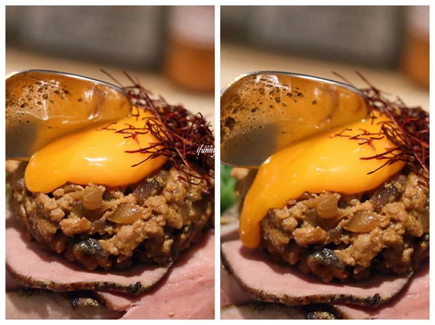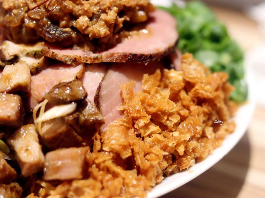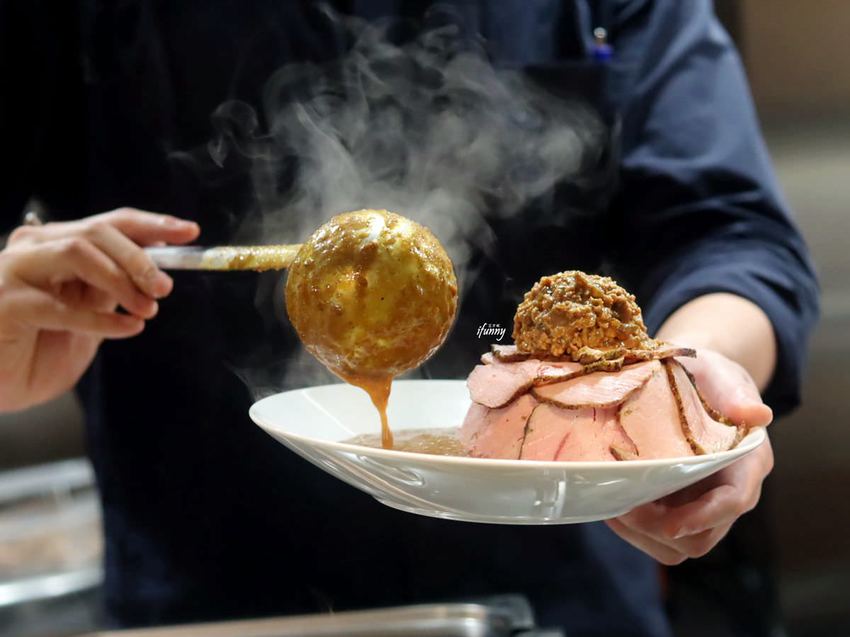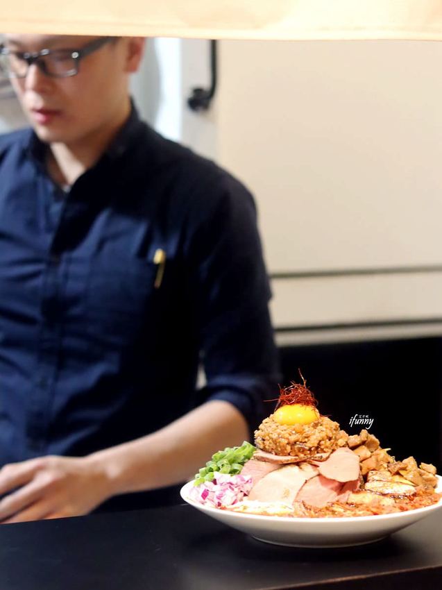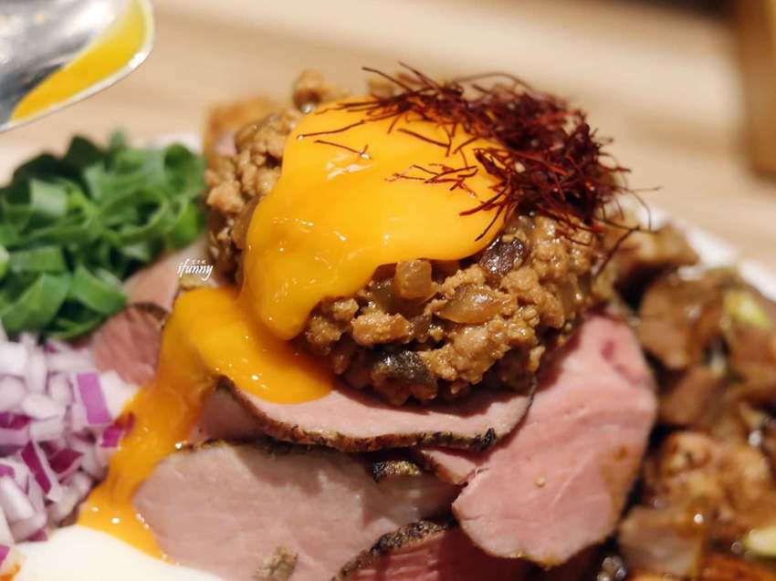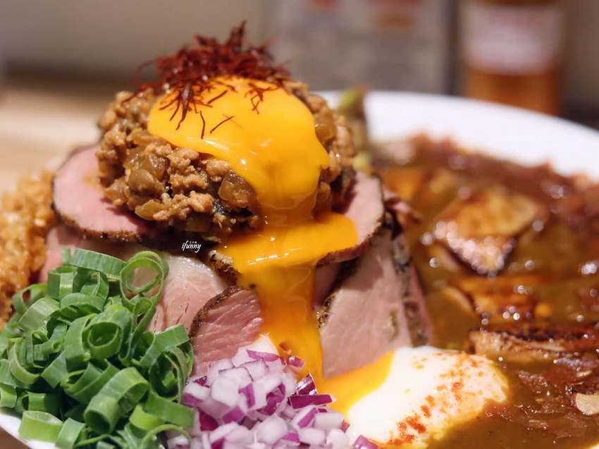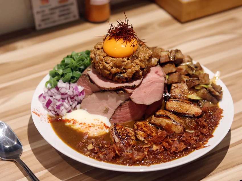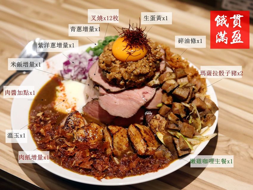 這碗<餓貫滿盈>是以嫩雞咖哩一份為底,加入12片的叉燒、一球肉醬,另外有新研發的瑪薩拉骰子豬兩份,更別說有增加口感的肉紙、油條、青蔥、紫洋蔥也都加量了!本來每份都有一顆溫泉蛋,現在肉醬上更加上了一個圓潤飽滿的蛋黃。這視覺效果真的好驚人啊!