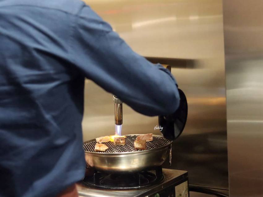 這次艾方妮事先預約了一個每週限定一份的<餓貫滿盈>,會確認客人抵達了才會開始製作,但這個製作上有點繁複,所以要等候一下。這次老闆多了兩位助手,這位助手正在炙燒舒肥過的雞肉。