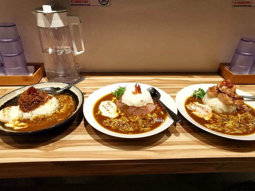 首訪盈 豚骨カレー咖哩飯專門時,我們把主要的餐點都點齊了,左起是肉醬咖哩、豚骨咖哩及嫩雞咖哩。