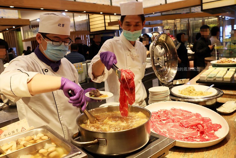 不停歇將牛肉涮入壽喜燒鍋,排隊領取每人一次一份