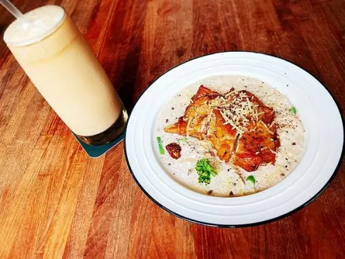 花醬培根芝心起司熱壓吐司,這種單點的也可以加價變成套餐。花生醬跟培根搭起來就是好吃,多了起司味道又更濃郁,就是一個吃了很有飽足感也很滿足的早餐。而且一定要熱熱的最好吃,一份吃完就很飽了。