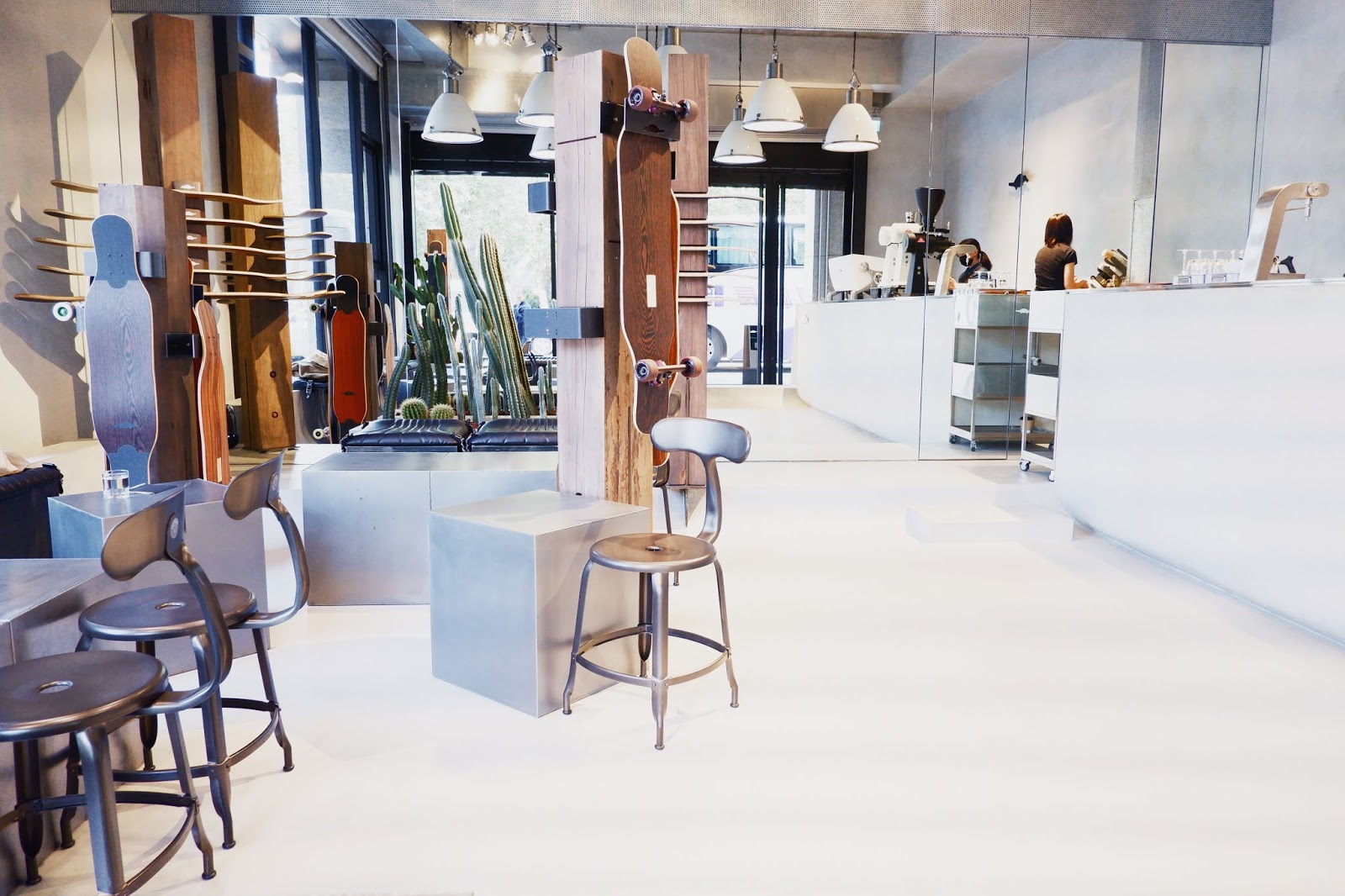 少見的不以制式排排坐的座位區,以鋼板材質的方型桌搭配皮革方椅,刻意以自家品牌的長板塑造如高木的裝置藝術,再加上仙人掌就成了城市裡的綠洲。這般衝突的意象更添The Platypus Café鴨嘴獸咖啡的特別之處。