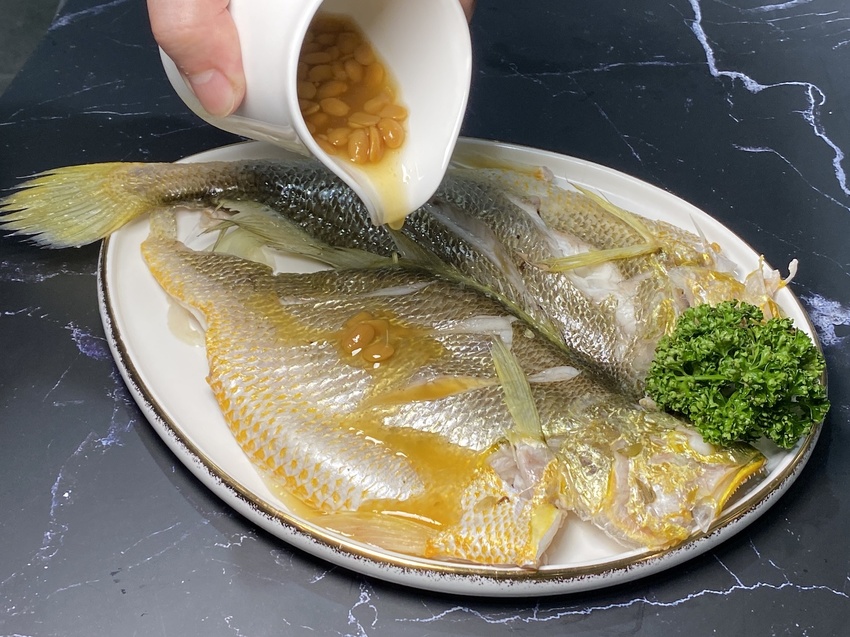「潮府醬香凍黃魚」這是一道由著名潮洲菜,選用新鮮的黃魚蒸熟後淋上主廚特製,潮汕萬用名醬「普寧豆醬」,再將黃魚放入冷藏,使魚肉收縮富有彈性,豆醬的香氣與黃魚的鮮甜軟Q,相信吃過了一次就再也忘不了這個美妙的滋味!「冬降雪花糖霜芋」選用大甲檳榔心芋頭,炸至酥鬆後與糖汁一起翻炒,在灑上青蔥珠,甜中帶有一絲鹹味,芋頭香氣在口中爆開,讓你一吃難忘。