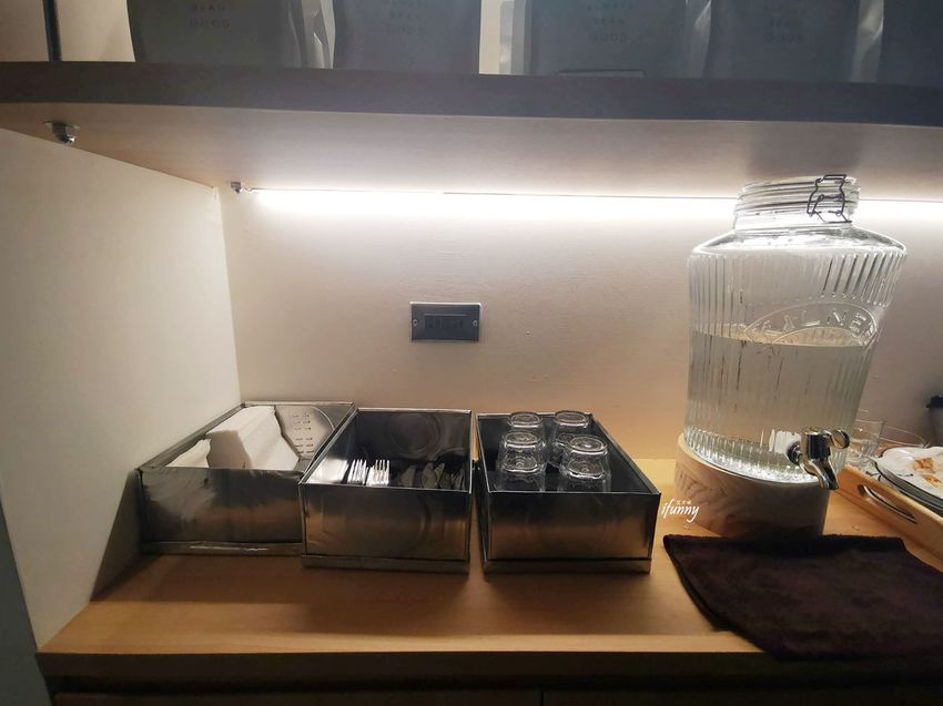 在內用區的底部,備有自助飲水及餐具區,一旁是回收餐檯區。