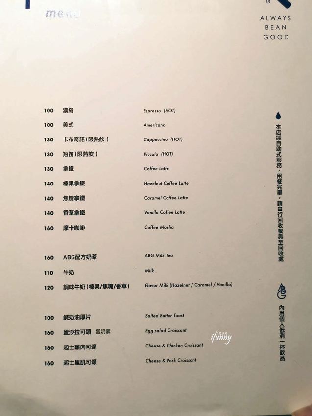 ABG Coffee提供簡單的義式咖啡及非咖啡因的奶茶、牛奶,另有四款麵包輕食。原本在網路上見到有人分享的提拉米蘇,由於製作流程繁瑣,因此每天只限量20份左右,這天晚來就吃不到了!