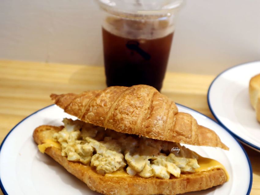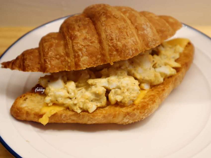 在一切為二的可頌底部放上了起司,再加上自家調製的蛋沙拉。帶著胡椒迷人香氣的蛋沙拉,跟鬆軟的可頌相當契合,但味道對艾方妮而言,稍微鹹了一些。