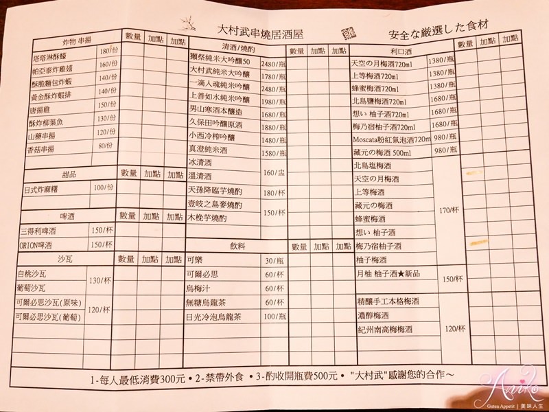 店內每人低消300元,若有自己帶酒酌收500元開瓶費! 🙂