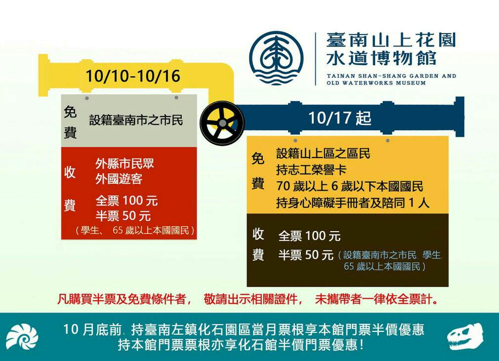 票根記得留著,持『化石園區』當月票根,享『水道花園博物館』門票半價優惠。