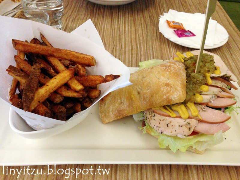 而圖上可看見火腿與火雞胸肉上方有黃芥末醬與酸黃瓜醬,底下的生菜部分也是頗多沙拉醬,我終於在今天才發現我對於醬料存在恐懼,因而整份三明治吃得滿困難的,早知道我應該點義大利麵,不過能藉由一份餐點發現自己害怕些甚麼也是頗值得的。