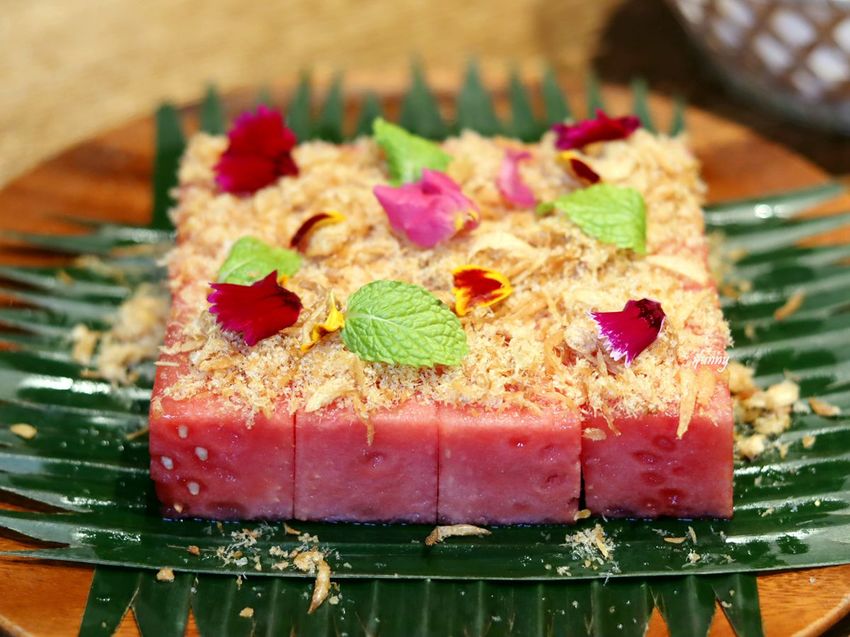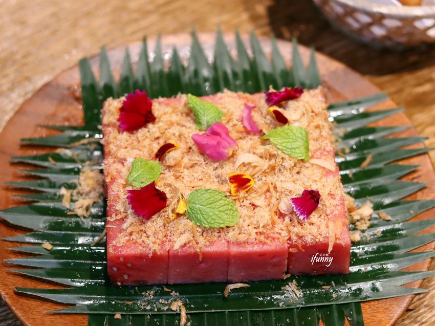 這是道是由泰國宮廷傳出的風味菜,底部放上切成四方整齊的西瓜,其上舖上的是魚酥烤乾後打成粉,拌入砂糖及紅蔥頭酥的特製魚酥,搭配薄荷葉一同食用。脆甜多汁的西瓜,加上鹹甜的魚酥,清爽的滋味很開胃。