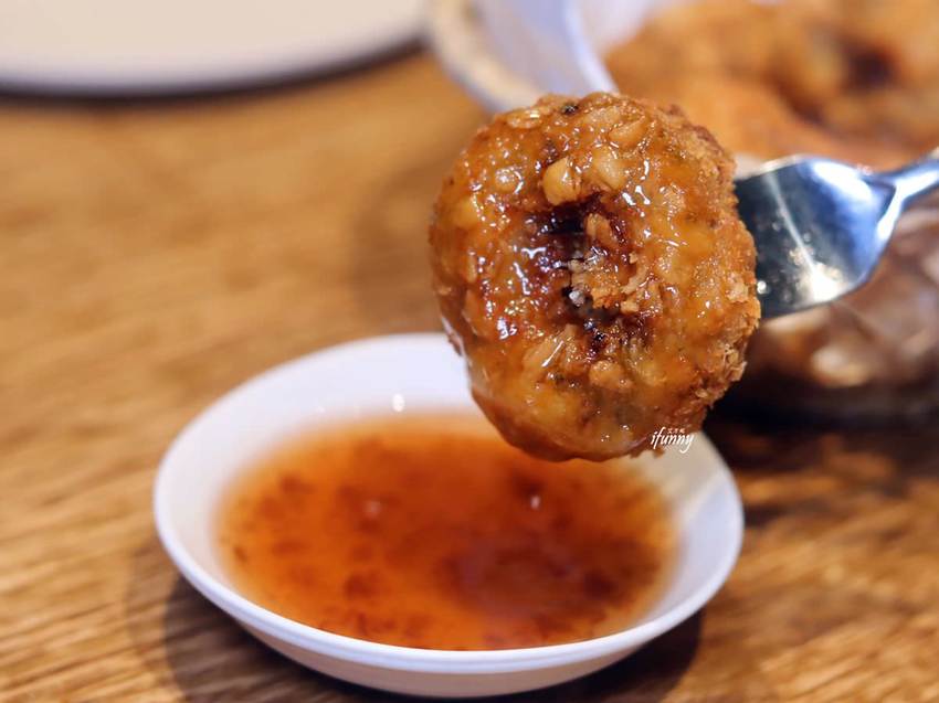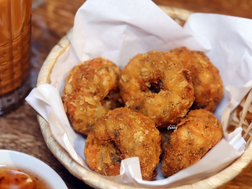 厚實的金錢蝦餅,使用新鮮中型虎蝦手工剁成不規則的蝦肉,一咬下後還能吃得到蝦子,沾點紫蘇梅醬,是百吃不膩的泰式料理。