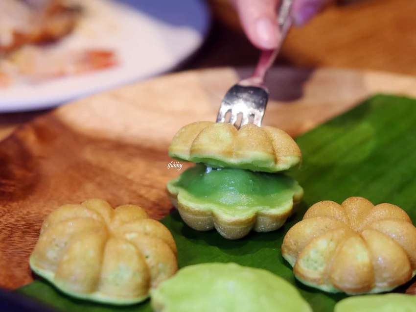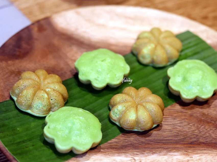 長相討喜的雞蛋糕是由香蘭葉製成,帶著清雅的綠色。