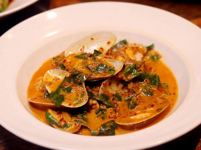 看起來紅通通的海瓜子,反而入口帶著椰漿的溫潤感,辣度反而沒那麼明顯。鮮美的海瓜子肉與濃香的咖哩,吃到食材與香料的完美結合。