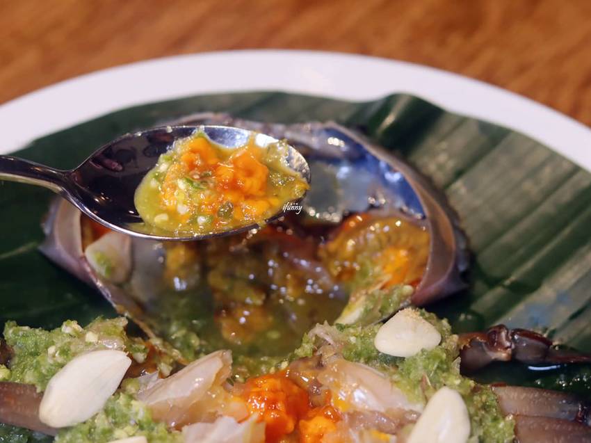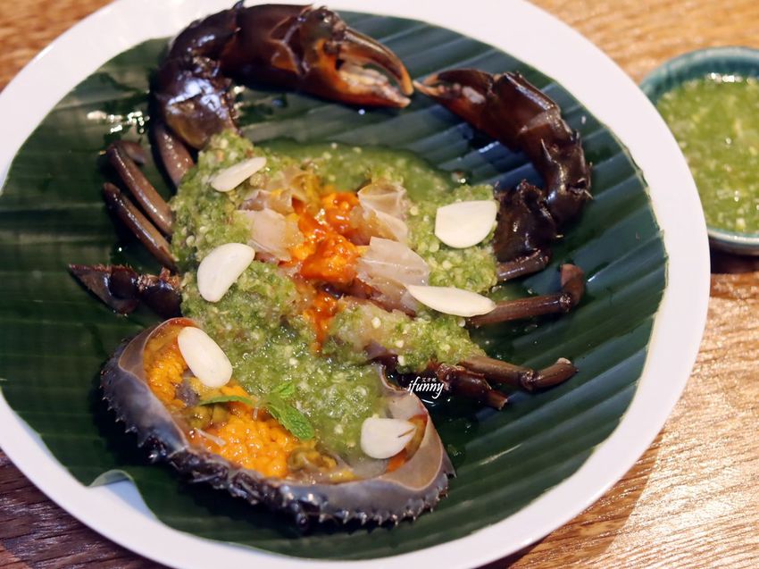 將紅蟳浸泡以魚露、椰糖、黑蒜頭等調製的醬汁至少五個小時以上, 是沒有經過烹煮過程的生蟹。其上及所附的綠色海鮮醬,是利用綠辣椒來去腥殺菌。那辣度是會令人噴火的那種,但也是相當過癮的辣度,無法吃辣的人要小心食用。