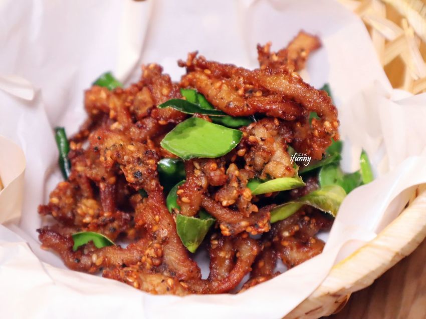 這道是baan曼谷最受歡迎的菜色,使用里肌與松阪豬兩個部位,手工修整至每條約15公分細長肉條再醃製,上桌前油炸至酥脆,手工繁複造就口感極佳的料理。