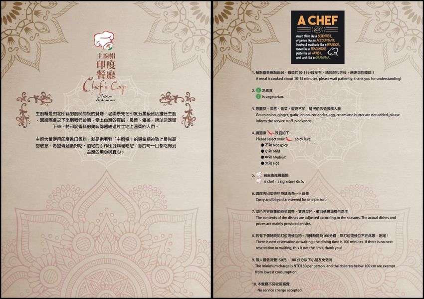 而《主廚帽》象徵主廚對自己身為廚師身份的專業,不僅只是傳達印度料理的美味,更堅持展現“主廚”的料理態度和用心。