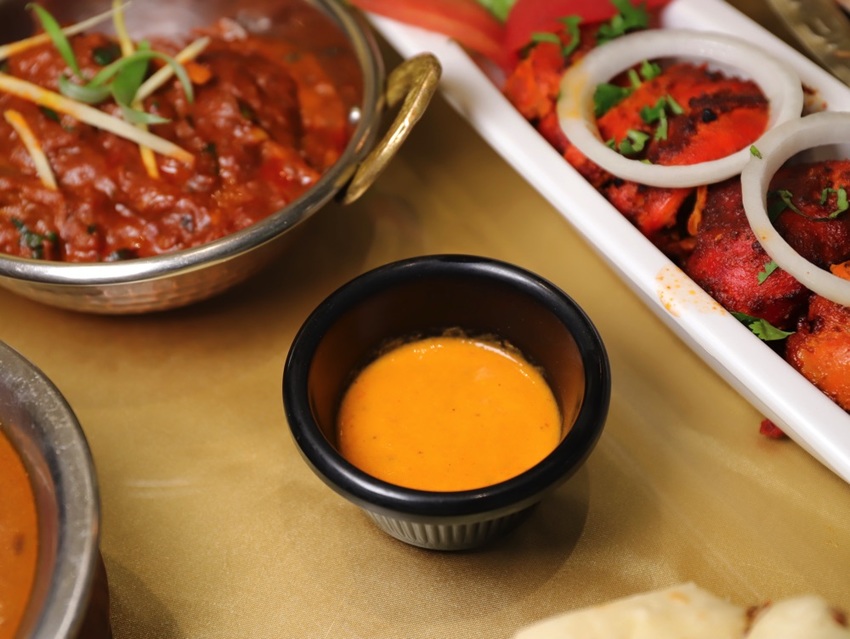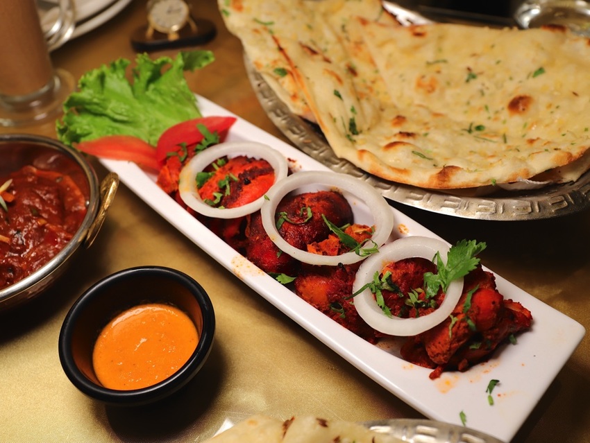 獨特的印度香料醃漬,然後炙烤上桌,上方擺著新鮮洋蔥圈