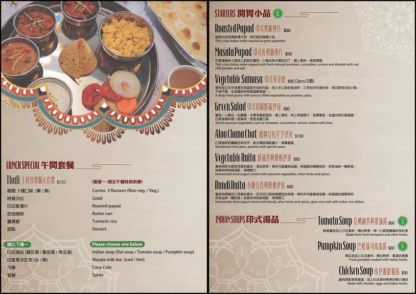 我和五十咩兩個人,算是食量正常(沒特別多,也沒特別小)的成人,所以我們各自點了咖哩+烤餅+飲料,飯&開胃菜 則是一起分享。