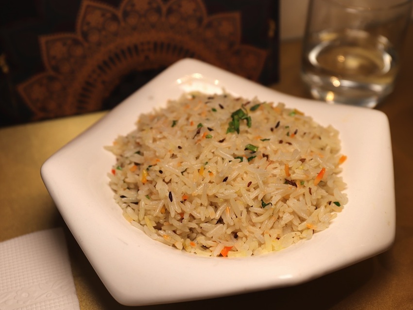 印度特有的 長形茉莉香米(?) ,可以看到米飯中混合了 “茴香子”(黑色一粒一粒的那種) & 橘色的紅蘿蔔(?)