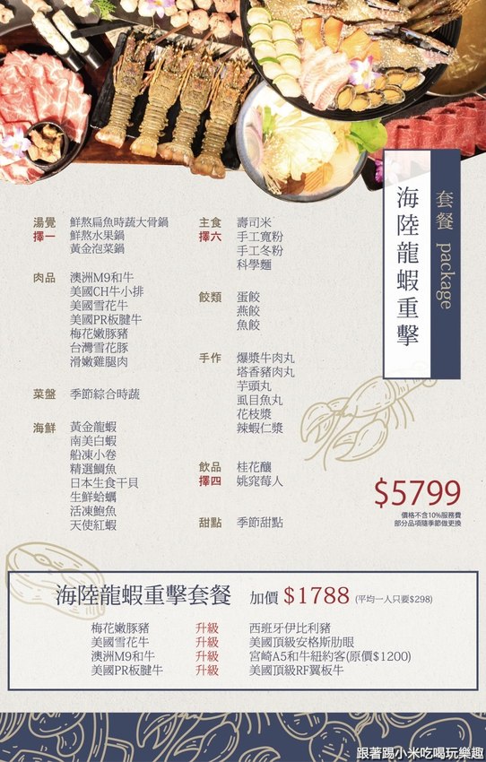 如果一人前來,可以做單點的部份;兩人以上,有套餐可以選擇,可以吃到肉肉又吃海鮮,算起來一個人只要500多元,還蠻划算的!也有三人及六人的套餐;如果有十人的話,可以點隱藏版的屠龍計劃2.0,還有這次推薦的窮人套餐的9,999元,可以吃到超豪華又新鮮的食材!