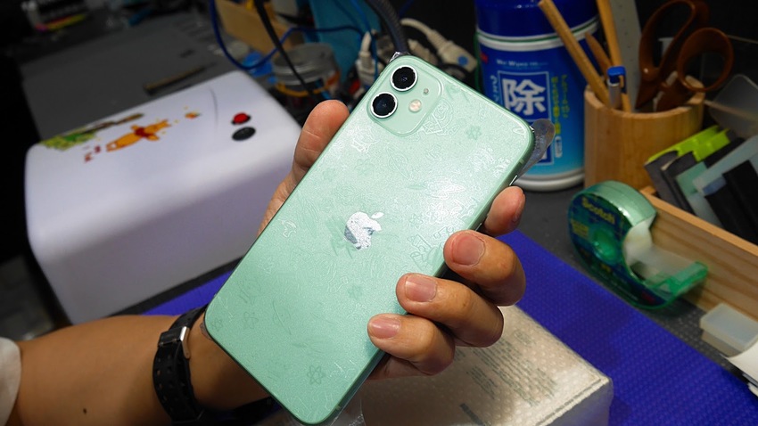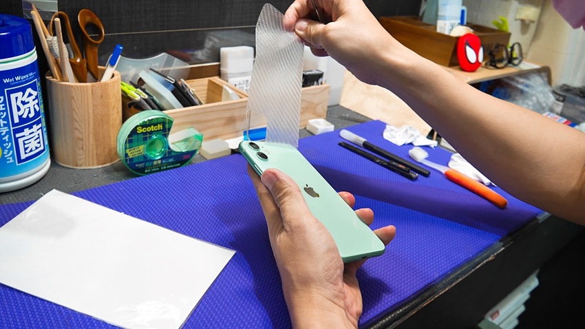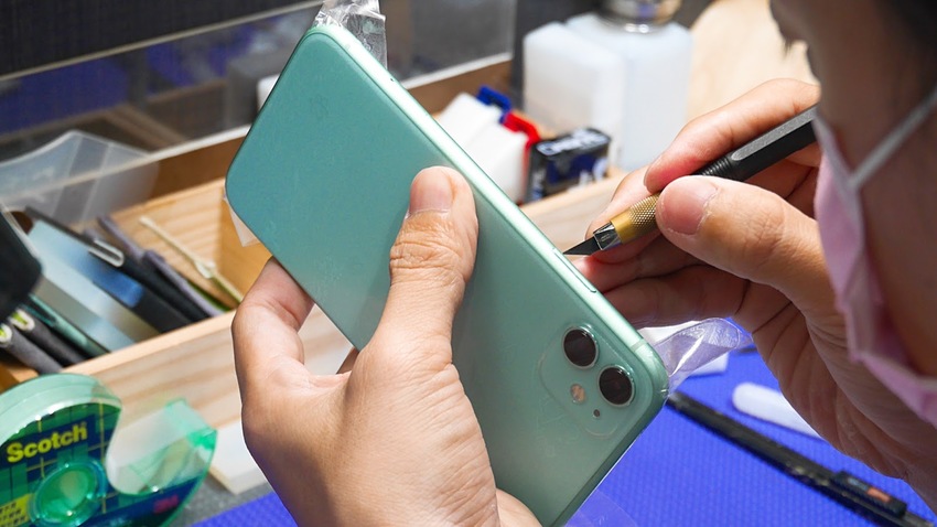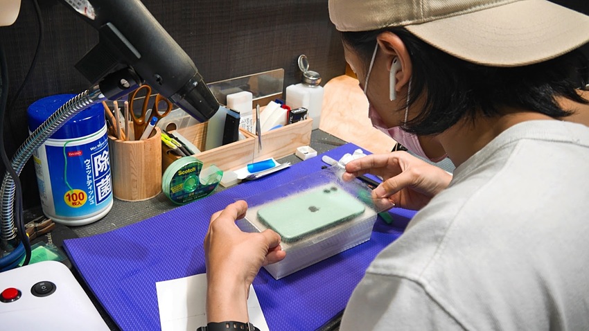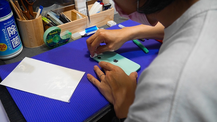 包膜施作前,包膜師正仔細地清除手機上的任何髒污或毛絮,因為只要有一點點沒清乾淨,都會影響包膜品質。