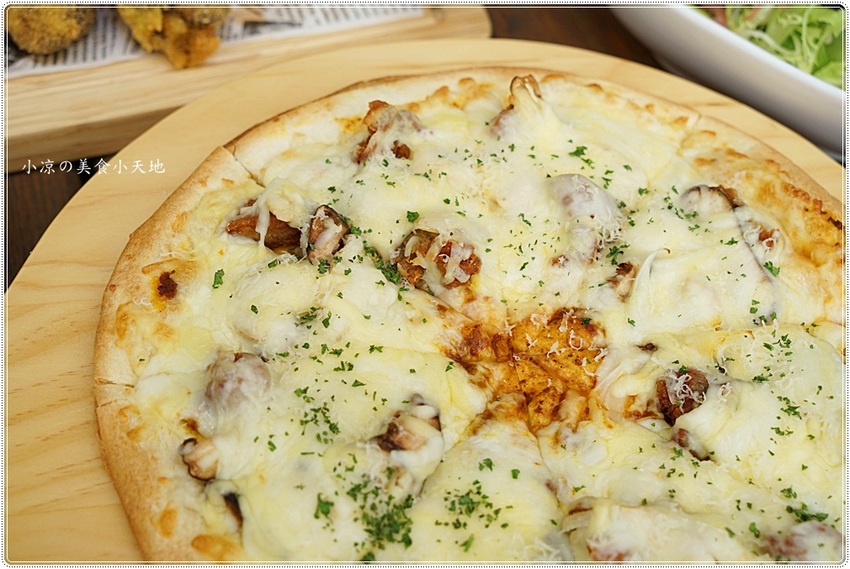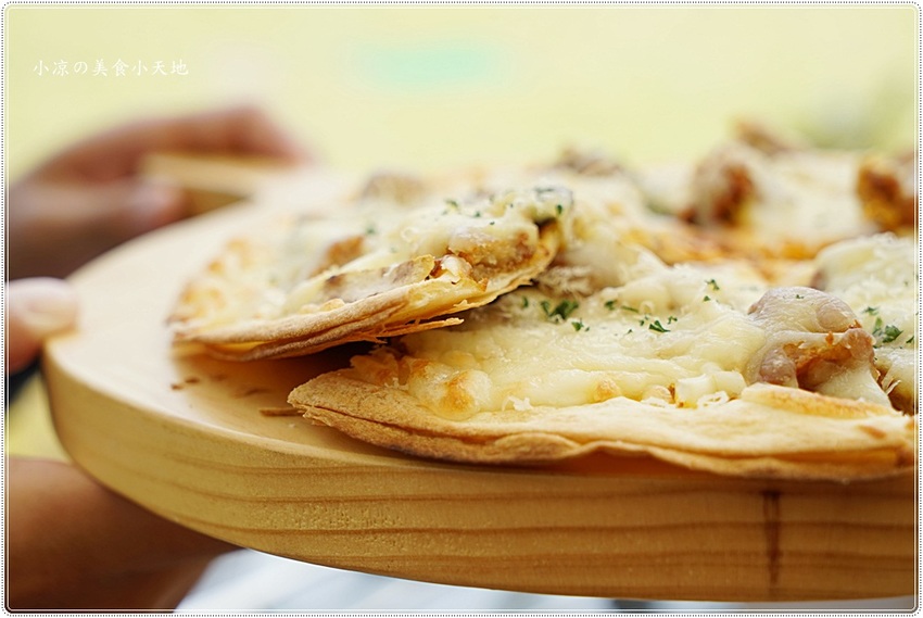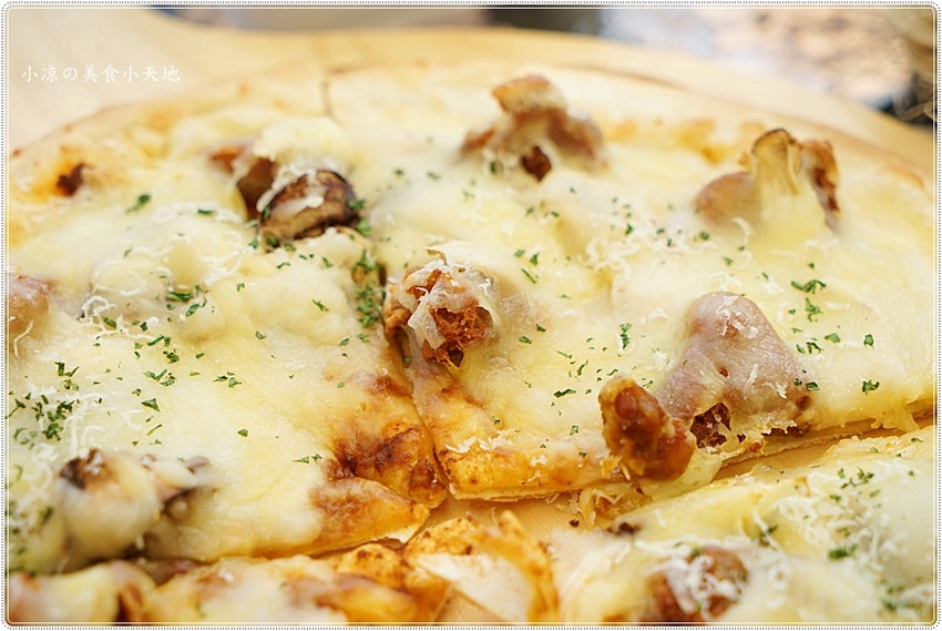 再撒上洋蔥、素香雞、香菇、兩種乳酪後再烤,屬於薄脆型的披薩喔~