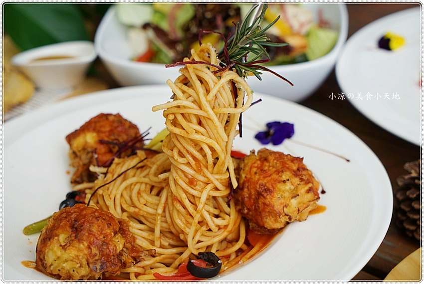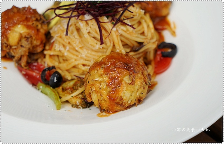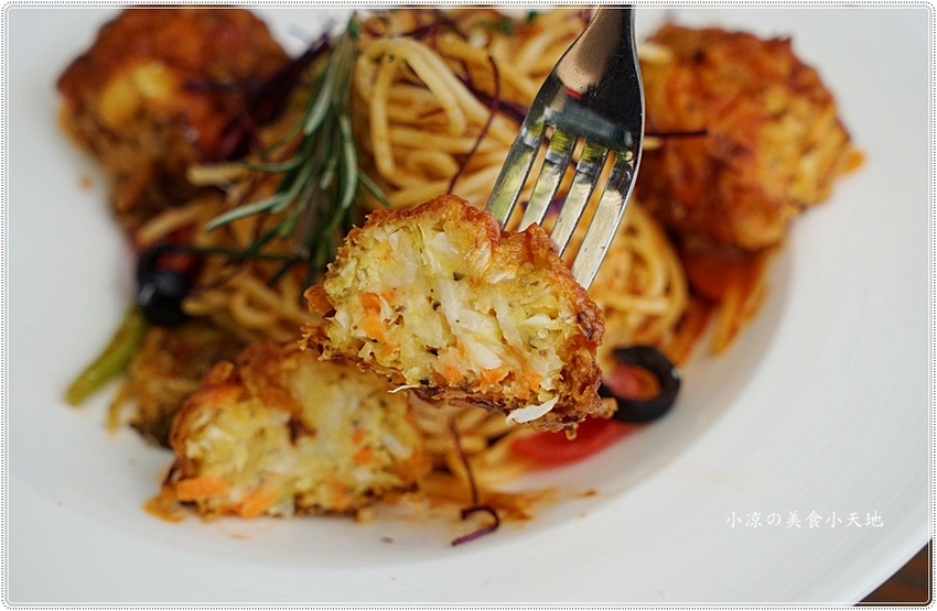 將中式的蔬菜丸與義式的茄汁麵條合併,想不到會如此的搭配….