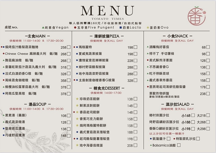 主食以義大利麵、燉飯為主,還有湯品、薄餅披薩、輕時光(下午茶)、小食(小點心)、溫沙拉