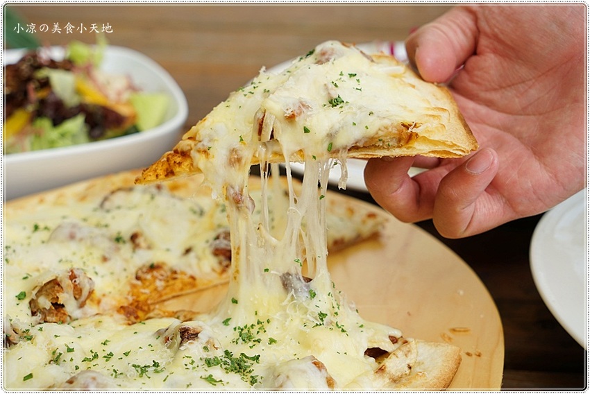 拿起時可以感受底層麵皮的薄脆,配料給的份量十足,輕輕拿起起司也跟著牽起絲來