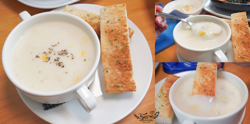 香濃的法式玉米濃湯,湯頭帶有菌菇香,沾上義式麵包是我最愛的吃法。