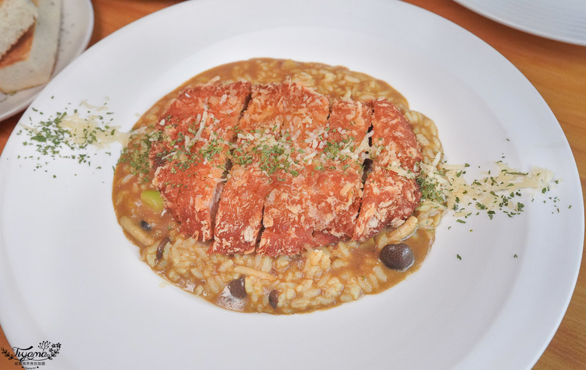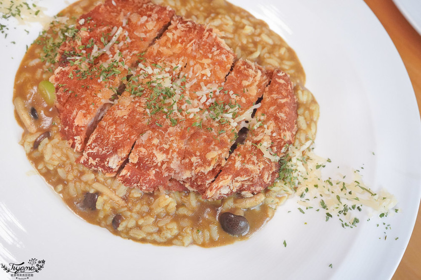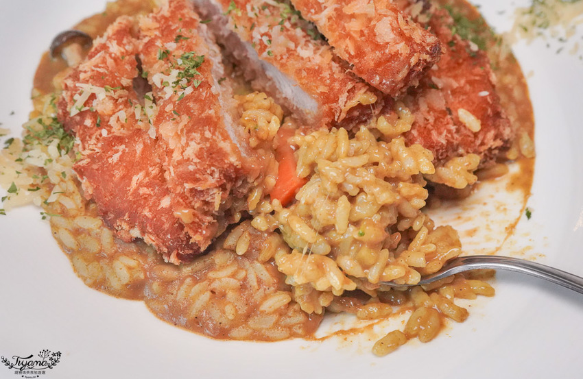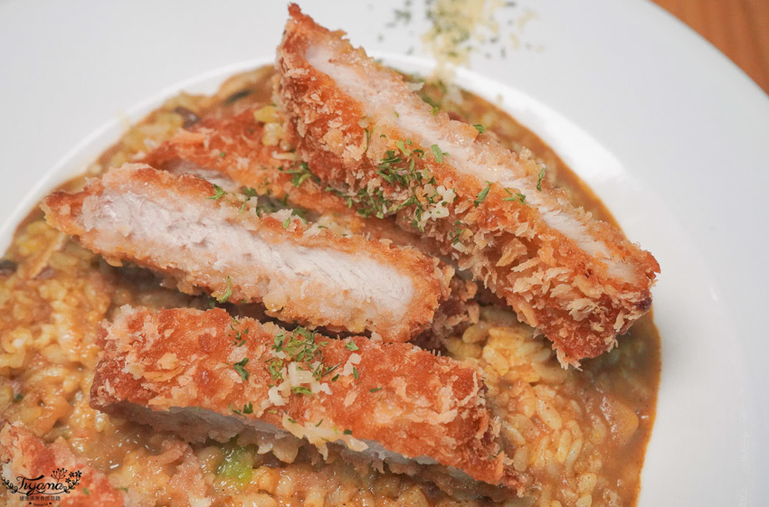 咖喱飯很常吃,而咖喱燉飯還是頭一次吃到,燉飯加進起司燉煮有牽絲感,這也讓咖喱醬汁緊緊鎖住在米飯上,一口燉飯一口炸豬排,好美味…這比咖喱飯還要好吃好幾倍。