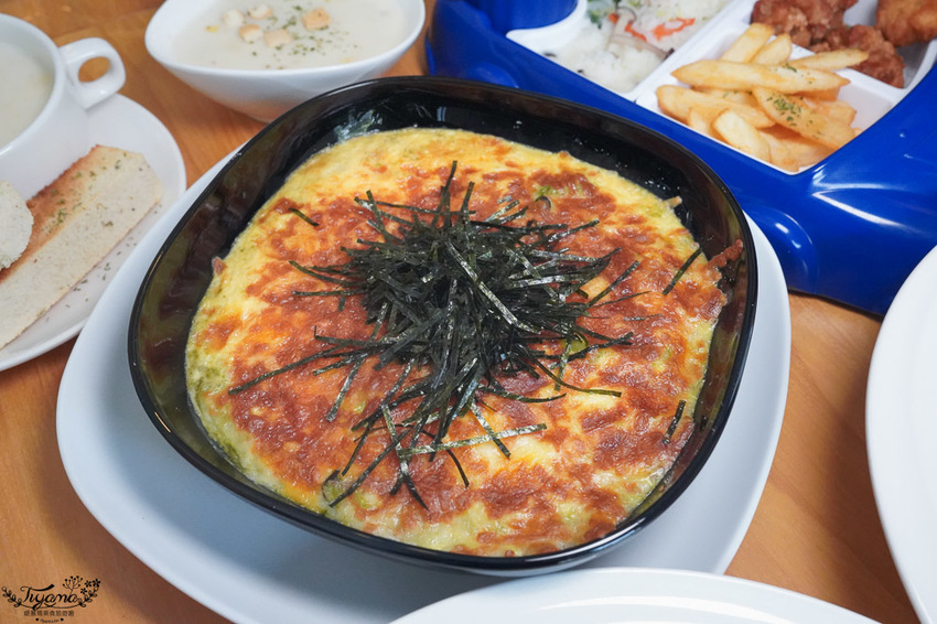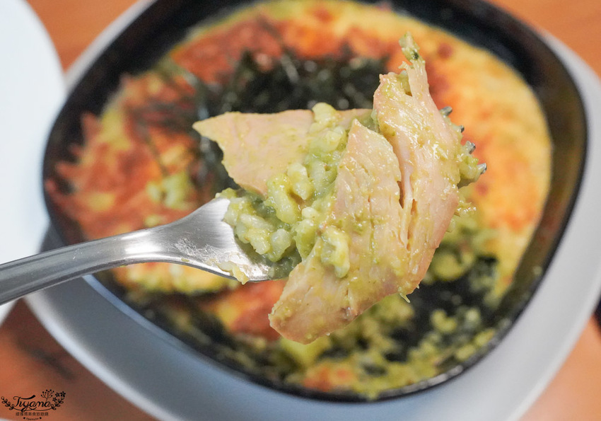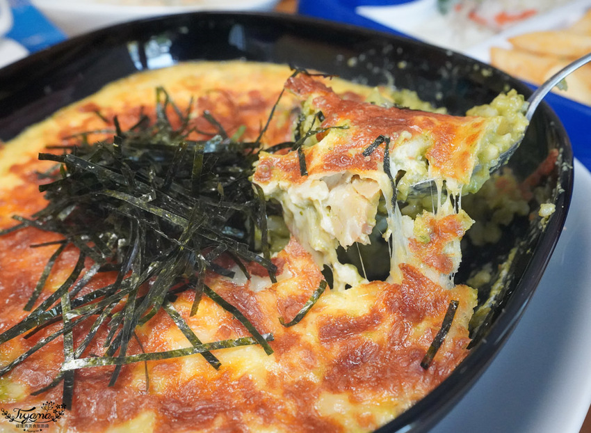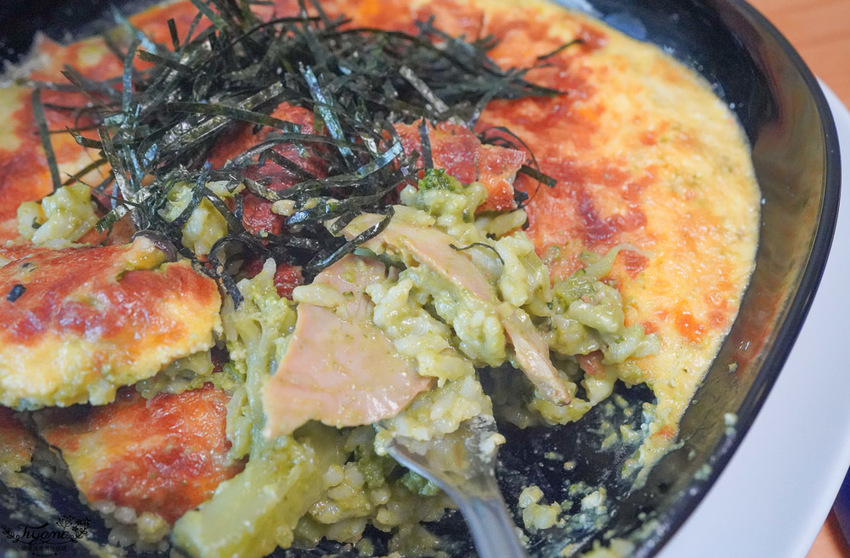 外層烤至金黃焦香的焗蛋飯,色澤看起來好可口,挖一匙立馬看到誘人的起司牽絲,鹹香蛋香雙享受。