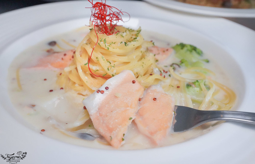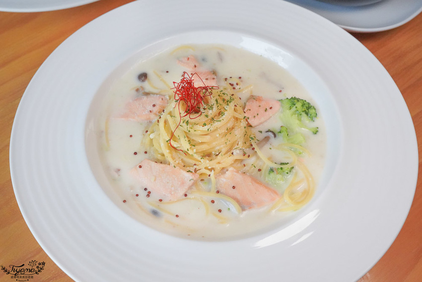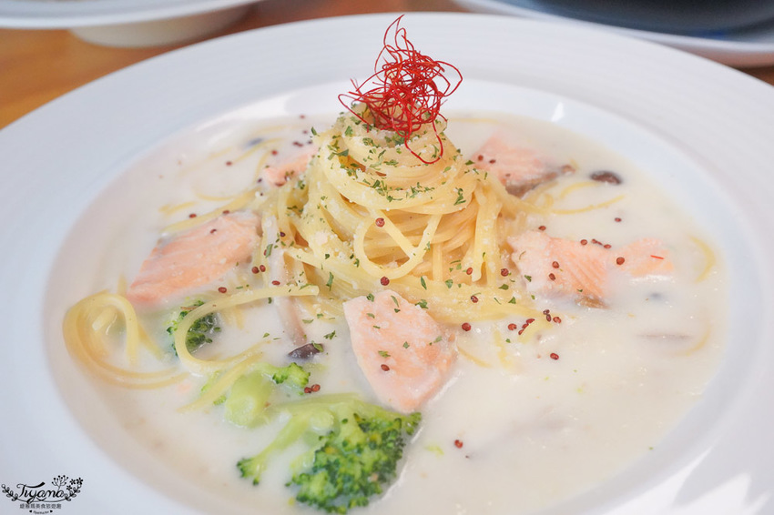 紅絲(辣椒絲)、起司粉、巴西利、紅藜,擺盤精巧一點都不馬虎,選用挪威頂級鮭魚,肉質鮮香細緻,滿足愛吃鮭魚的我們。