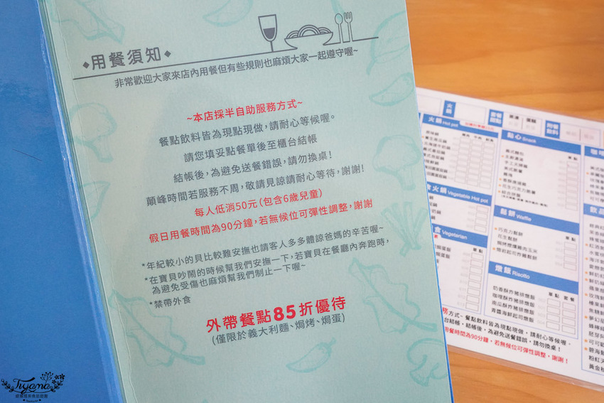 餐廳採半自助式服務,填完單至櫃檯結帳,假日用餐90分鐘,每人低消$50(包含6歲以上兒童),外帶享85折優惠。