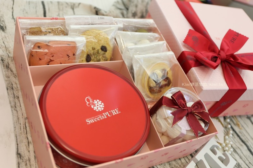 曲奇餅不在是以鐵盒呈現,同樣的可以搭配手工餅乾或者是因應環保綁緞帶當伴手禮送人都很漂亮呢!像我們去朋友家作客,若不想再帶水果、甜點,不妨來SweetsPURE溫感烘焙挑選後,請服務人員綁上緞帶,送禮收到的人也會覺得很開心。
