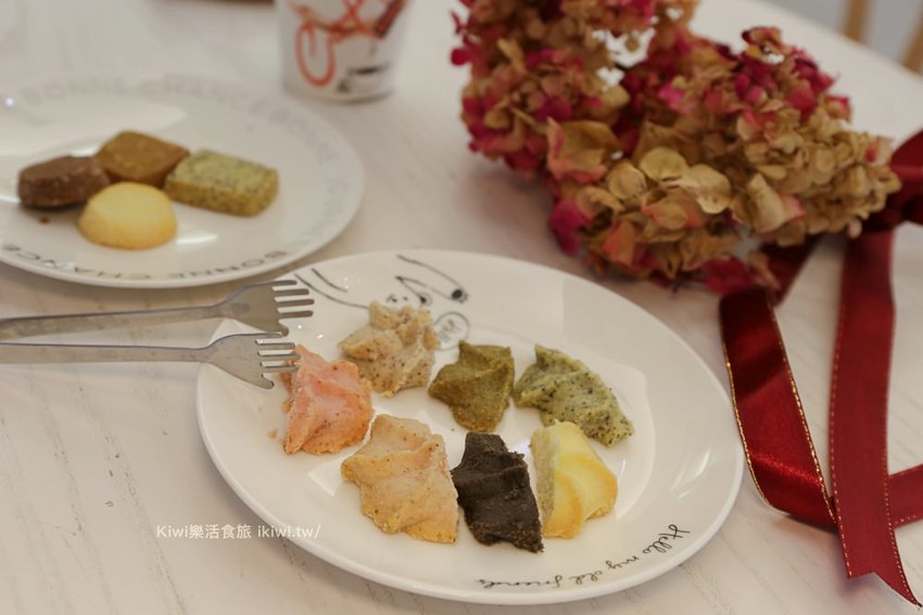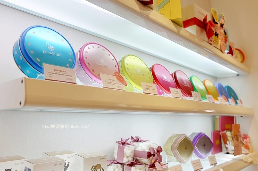 七彩的精緻鐵罐餅乾,就是裝著各樣口味的原味、可可、玫瑰、草莓、伯爵茶、日月潭紅茶、乳酪起士、抹茶、咖啡、還有限定版櫻花口味,是全台口味最多之冠,常態熱銷曲奇餅與限定時節的曲奇餅,都建議要提前預訂,每日商品都有限。