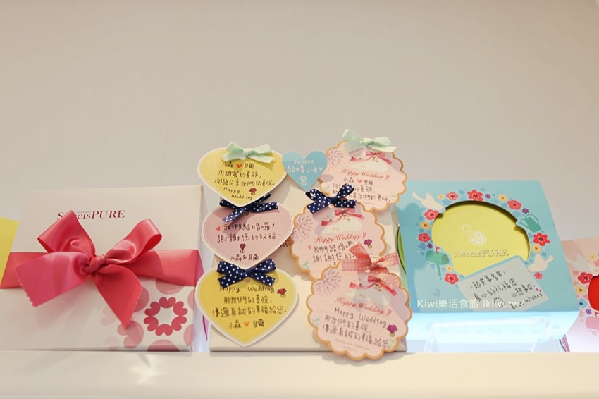 右手邊的牆面上,最上方一層皆是店家的專屬禮盒,手巧的緞帶都是服務人員綁的喔!右側的貼心小卡可是服務人員一字一字的為新人寫下祝福的話,曾經還有人拿著卡片要來認識服務人員,小卡真的超夯的啦!