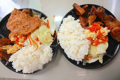 這便當裡面火肉份量很多油雞是整隻,三種配菜皆同有淋上醬汁提味。