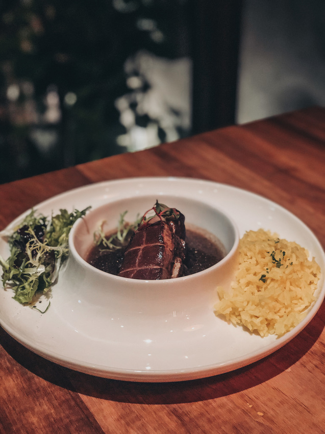 這是道費時三天的料理,醃製、熬煮、靜置,紅酒的酸澀配上豬五花的油脂以及香料飯,毫無違和感,入口即化。