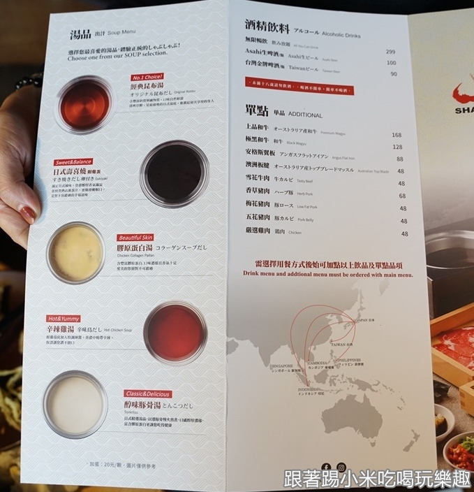 有經典昆布湯、日式壽喜燒、膠原蛋白湯、辛辣雞湯及醇味豚骨湯,五種都是日式湯頭,味道上都是濃郁好喝喔!也有提供部份單點肉品。