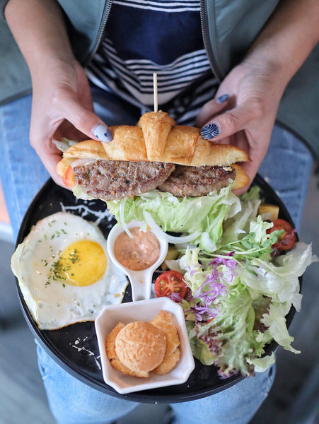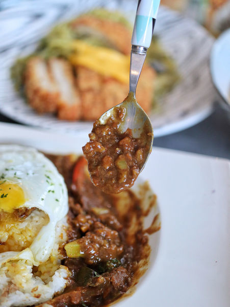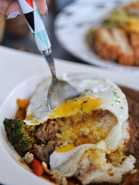 ▫️最近很夯的咖哩飯這裡也吃得到,醬汁濃稠,香料味樸實直接,配的肉品跟可頌堡裡頭是相同的牛肉漢堡排,藏在太陽蛋下,一湯匙下去,突破層層食材抵達盤底後挖起再一口吃下,超滿足ヾ(*´∇`)ノ