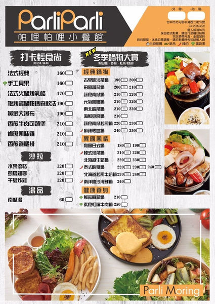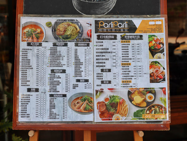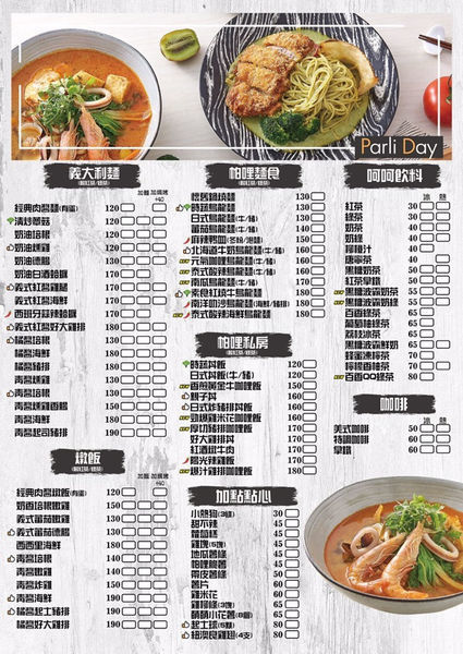 門口提供菜單可以先參考,相當平價不傷荷包的佛心價,除了義麵燉飯也有許多台式餐點哦。